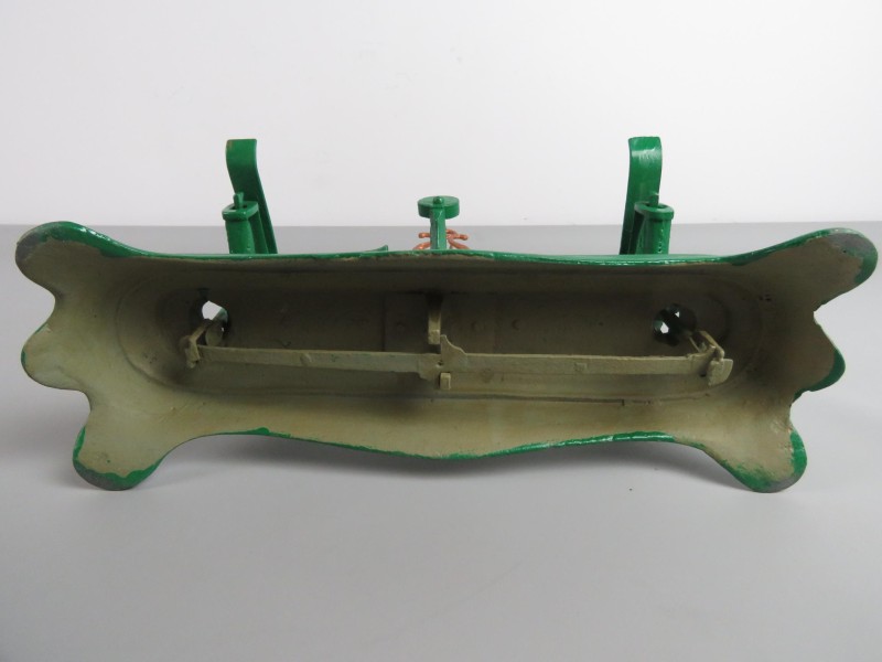 Giet ijzeren weegschaal met 2 messing schalen. Groen geverfd. Kan tot 2 Kilo kracht.