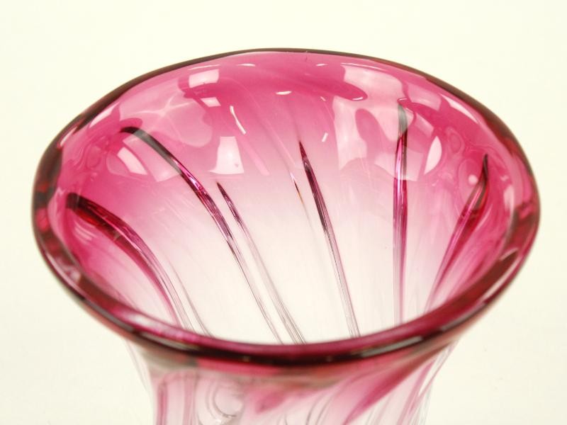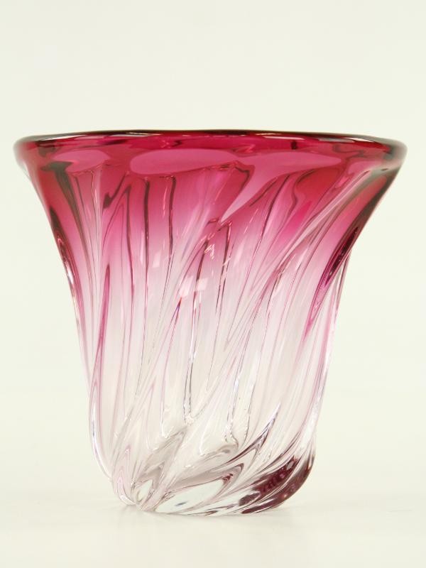 Gedraaide, kleine vaas uit kristal van de gerenommeerde Belgische kristalfabrikant Val Saint Lambert. Het gaat om de kleine versie van het Torsade-model, een ontwerp van René Delvenne. De vaas werd geproduceerd circa jaren 50-60. De vaas heeft een kleurverloop, waarbij de onderkant helder is en de bovenkant een donkerroze kleur heeft. Onderaan vinden we de gravering 'Val St. Lambert'.