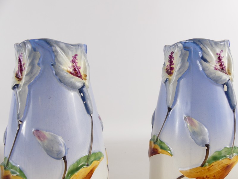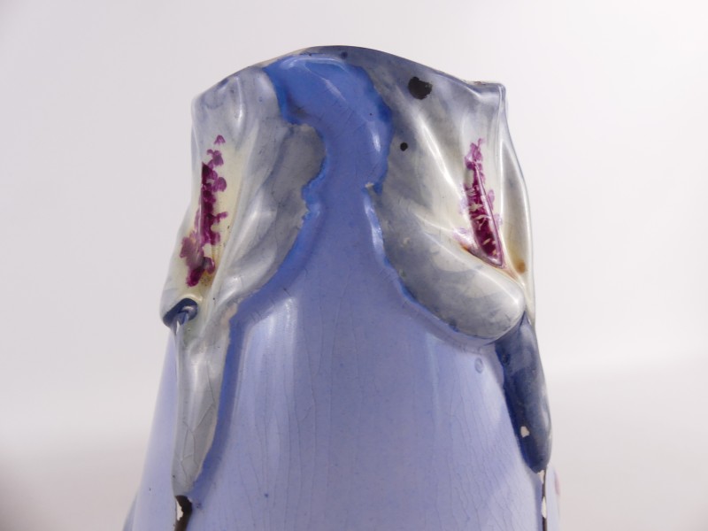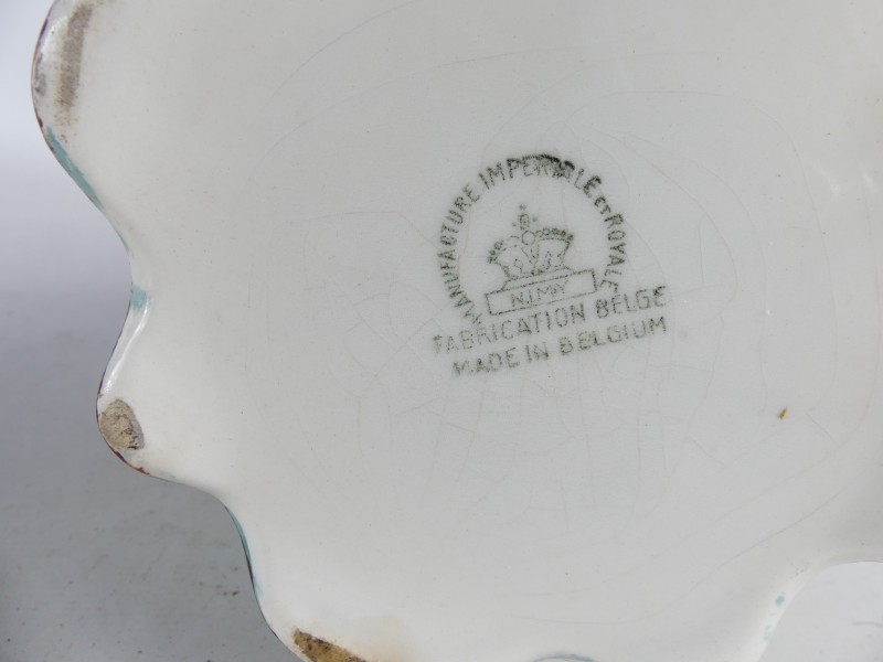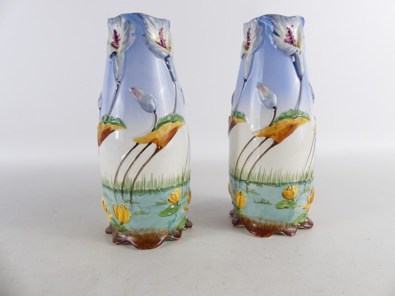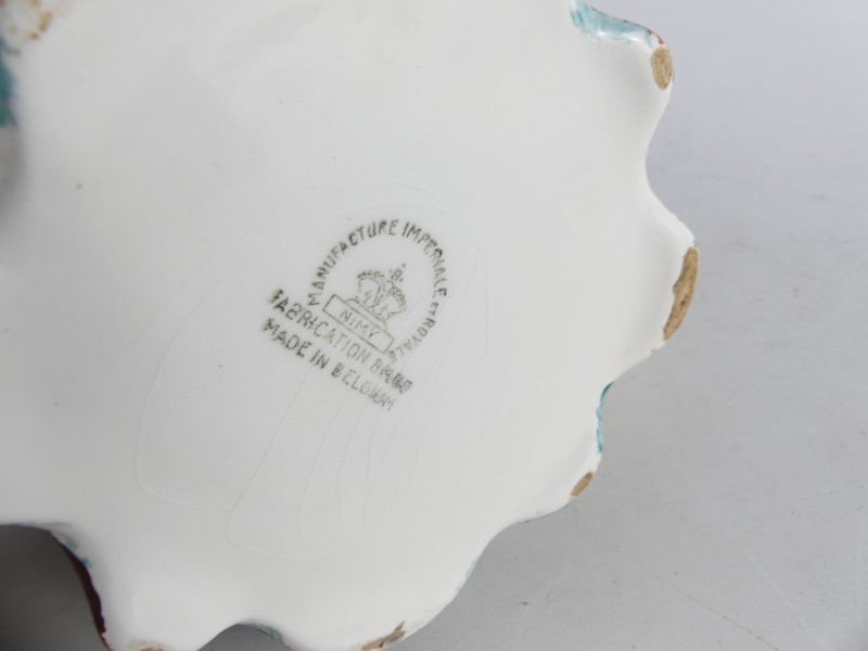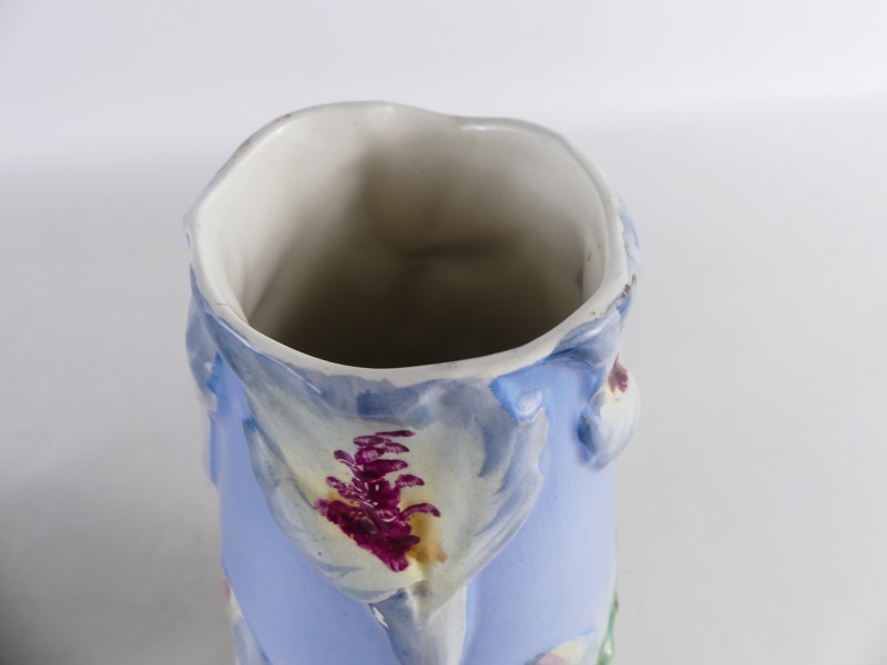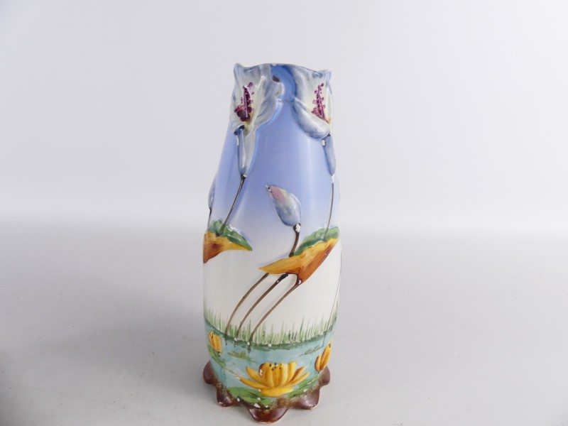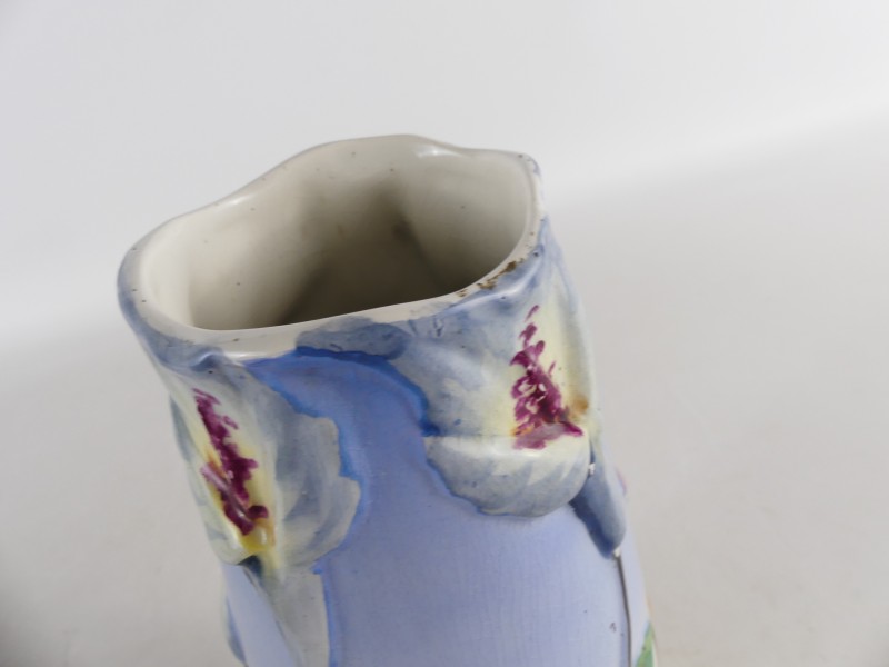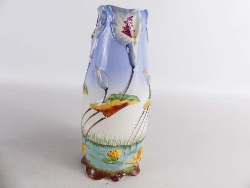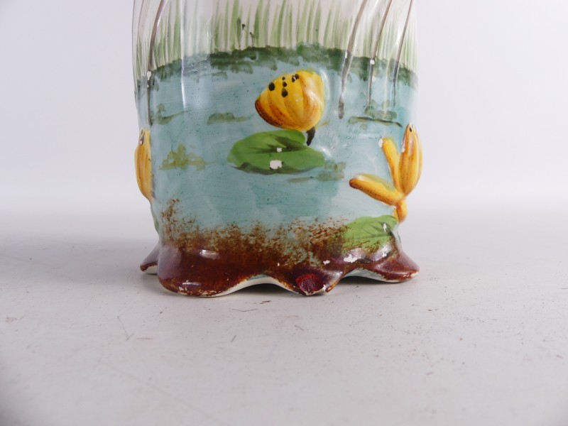 Gedecoreerd met waterlelies en irissen in reliëf, uitgevoerd in zachte pastelkleuren. Onderaan gemerkt met Made in Belgium. Mooie Art Nouveau-stijl. Enkele kleine chips en lichte verfslijtage aan de basis.