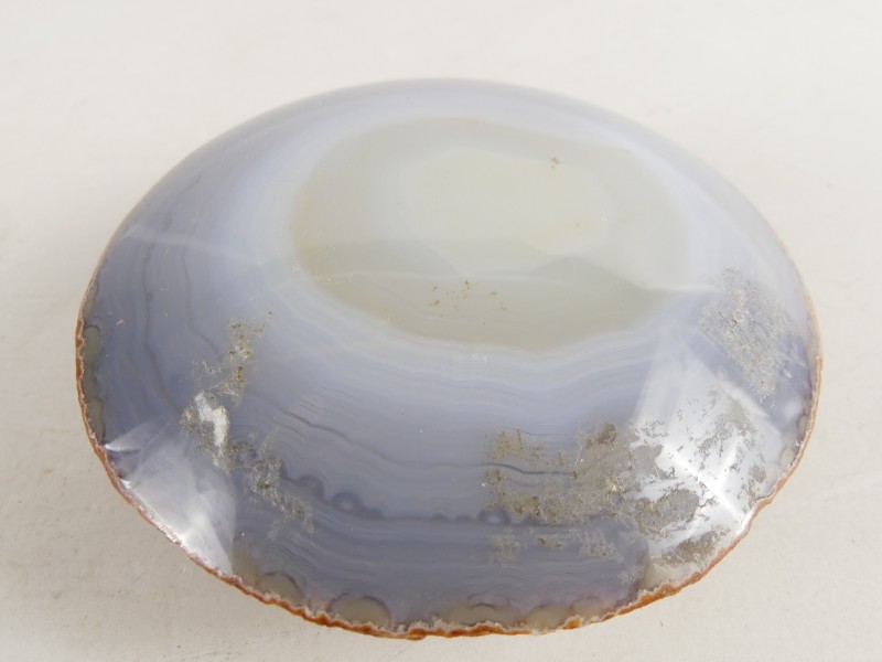 Een bijzondere set van negen mineraalgesteenten van agaat, deels in de vorm van schaaltjes. Elk stuk is gezaagd en gepolijst uit een natuurlijke geode, met de kenmerkende ruwe buitenzijde behouden. De binnenzijden tonen prachtige, natuurlijke bandstructuren in tinten grijs, paars en wit, wat elk stuk uniek maakt.