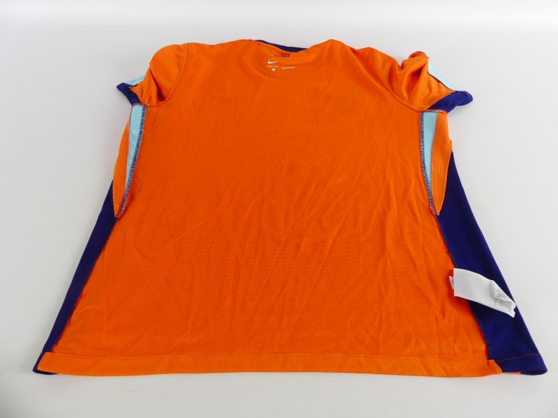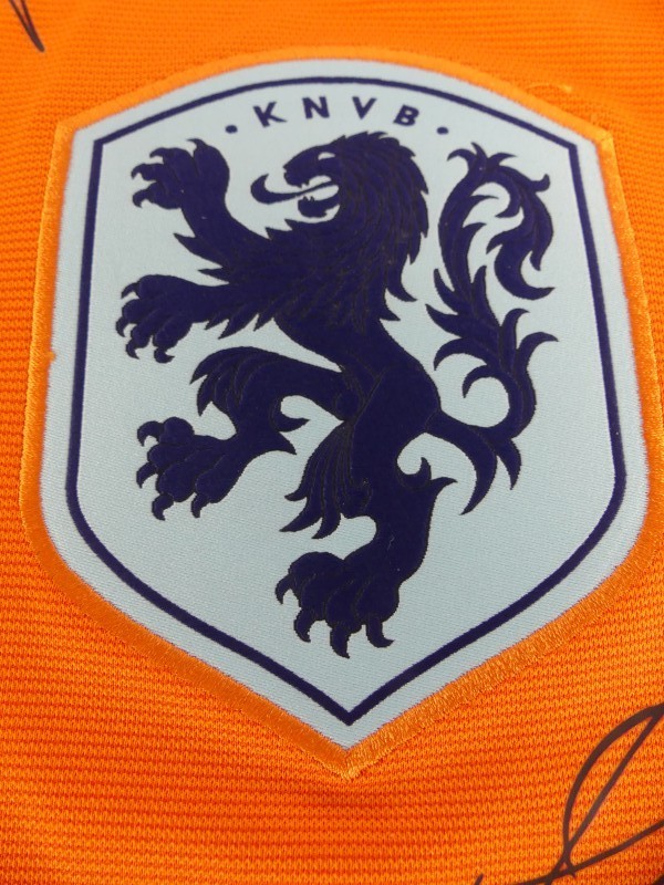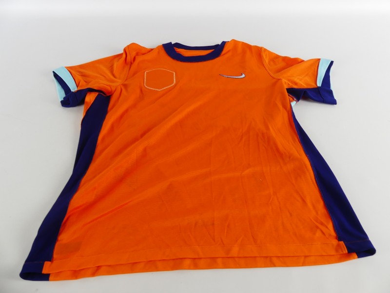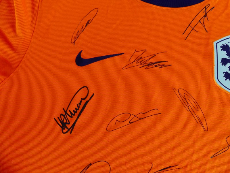 Nederlands voetbalshirt, geproduceerd door Nike als exclusief product voor de KNVB. Het shirt is uitgevoerd in de kenmerkende oranje kleur van het Nederlands elftal en voorzien van geprinte handtekeningen van spelers, wat het een bijzonder verzamelobject maakt.