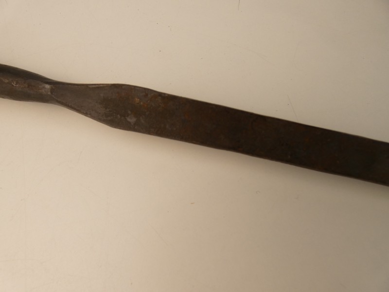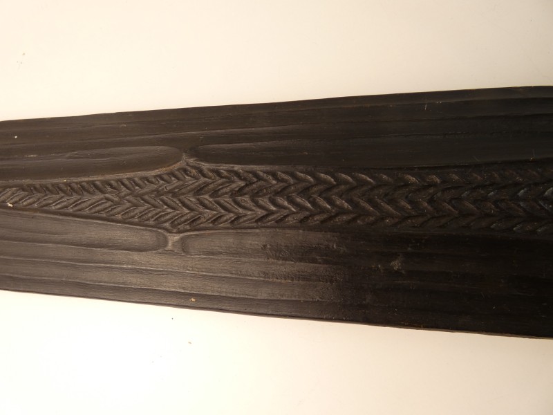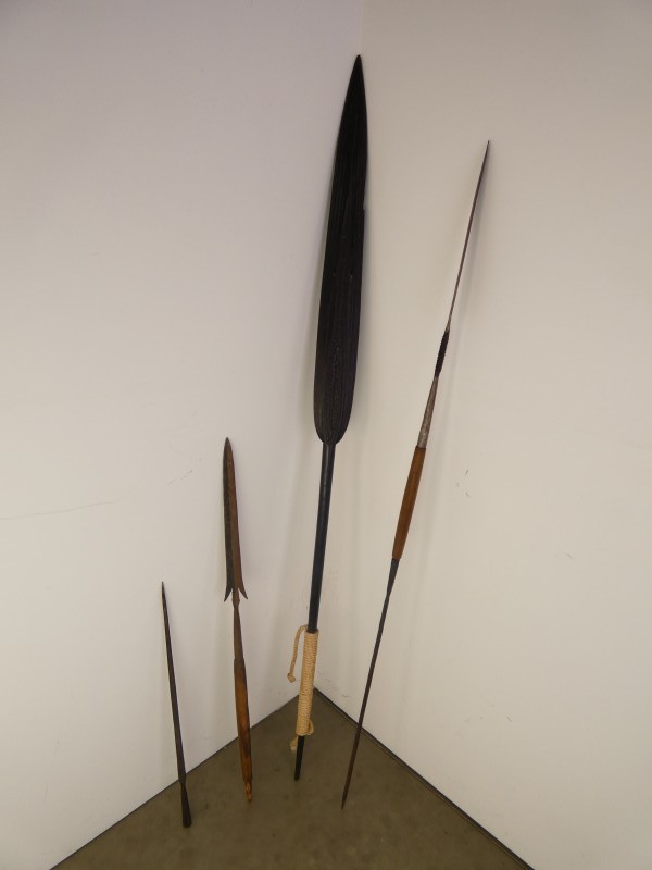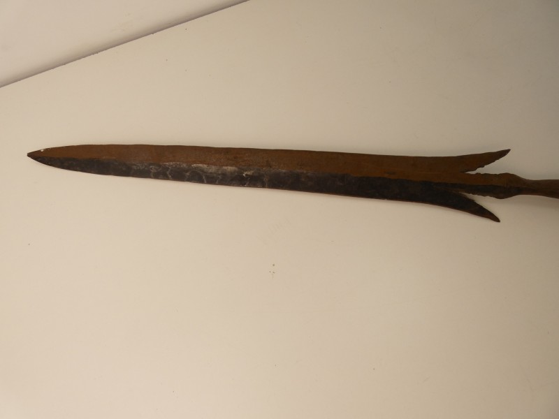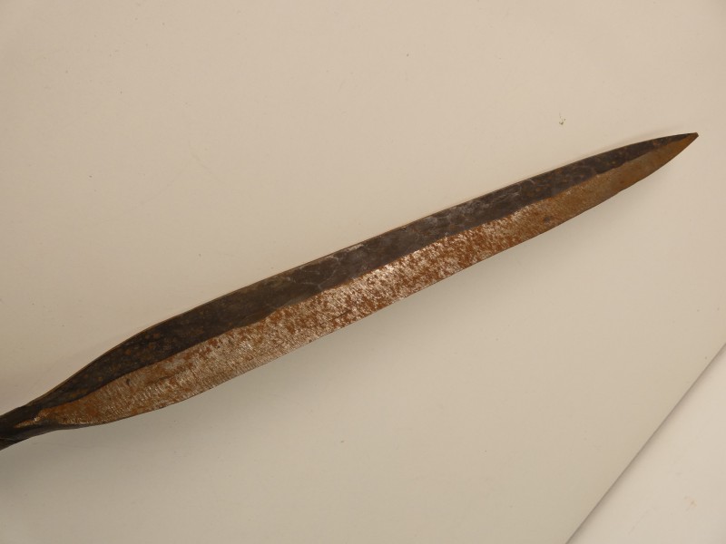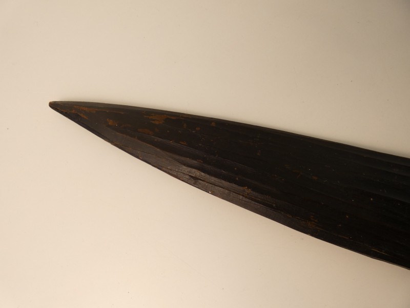 - Houten speer met groot blad en touw gespannen als handvat, totale lengte: 1,51 cm