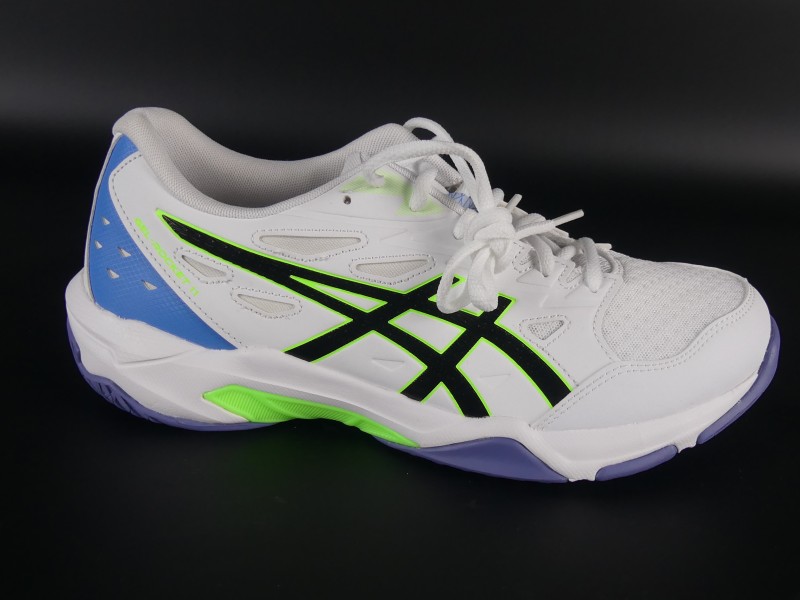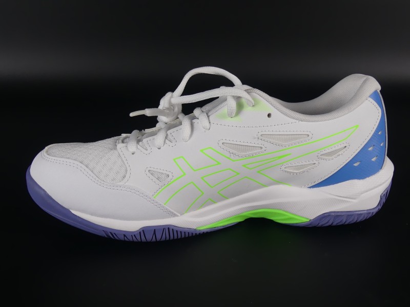 Kleur: Wit bovenwerk, neon groene tussenzool, paarse buitenzool en zwart ASICS-logo.