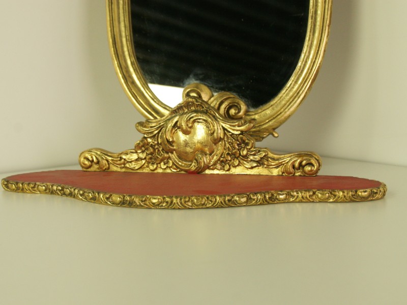 Vintage houten wandspiegel met goudkleurige verf met bijpassend roud- en goudkleurig plankje, beide items zijn in barok stijl.
