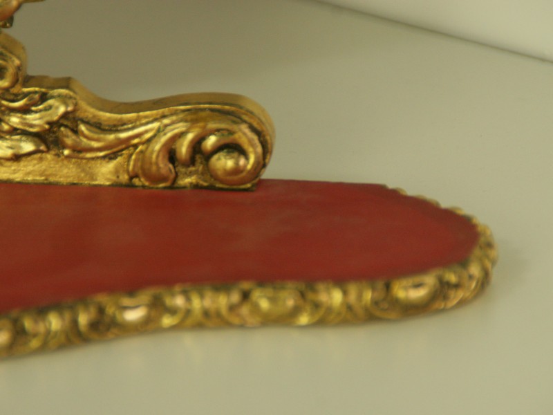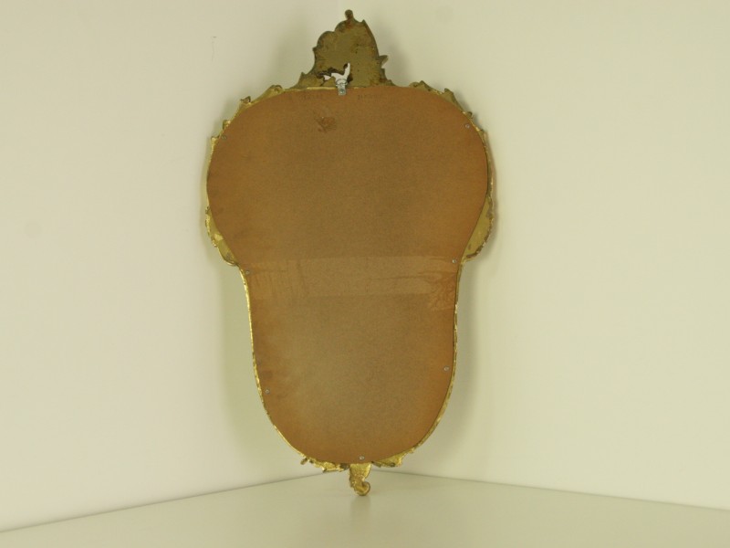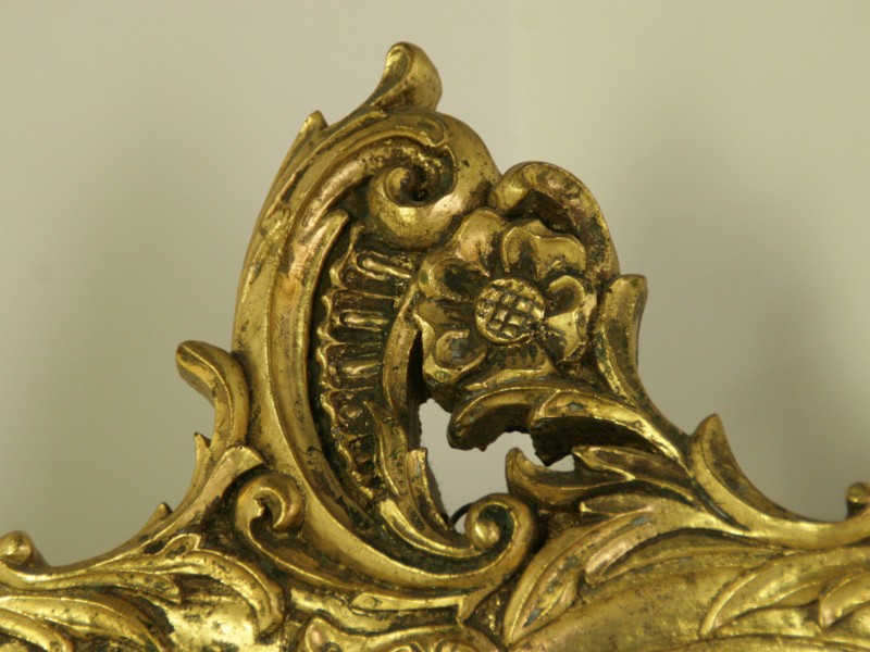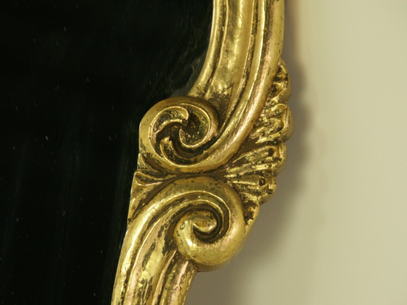 Ouderdomssporen aanwezig, oxiadtiesporen, krasjes en barstjes in het hout, goudkleurige verf vervaagd wat hier en daar, klein krasje in het glas van de spiegel..