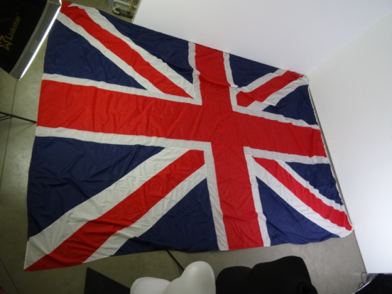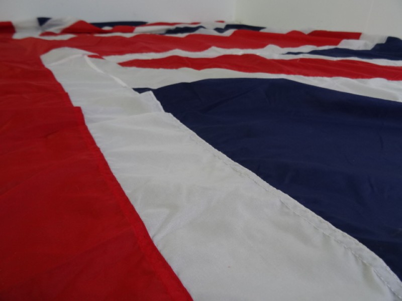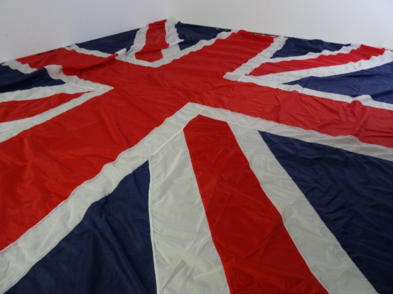 Grote vintage vlag van het Verenigd Koninkrijk die ook wel bekend staat als de Union Jack. Aan de hoeken hangen metalen ringen om de vlag op te hangen.