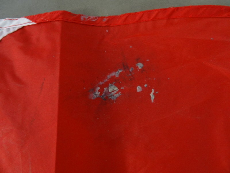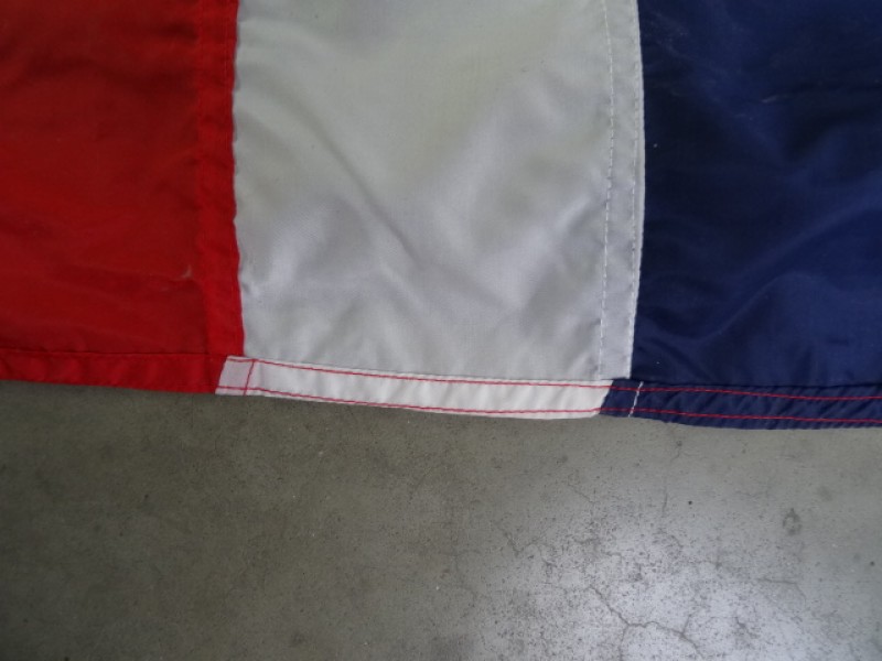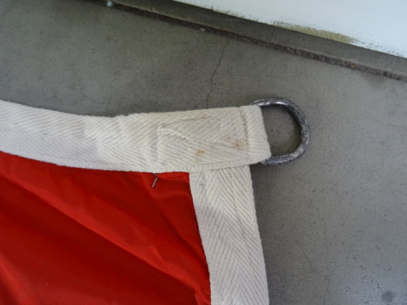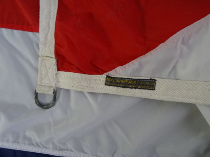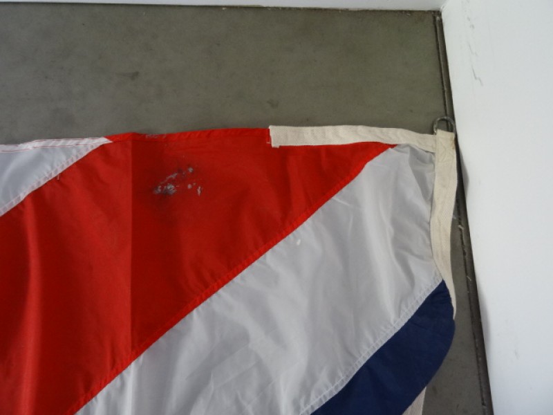 Gebruikssporen aanwezig op de vlag, vlekken, oxidatiesporen aan de metalen ringen, losse draadjes hier en daar.