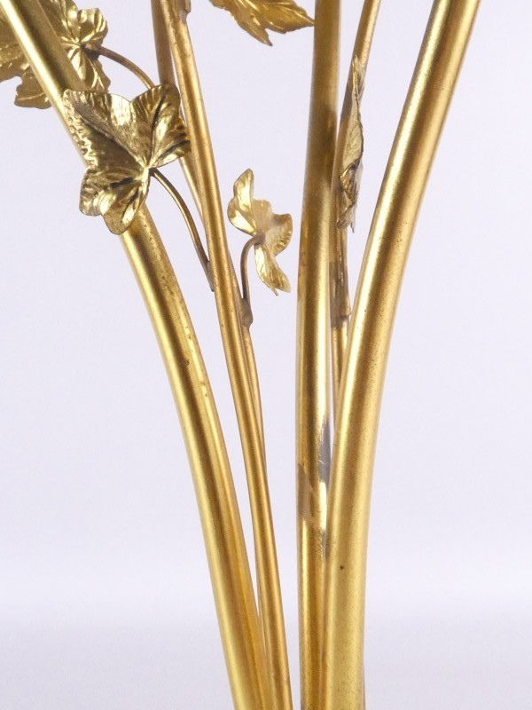 Het sierlijke metalen frame is warm goudkleurig afgewerkt en versierd met organische, bladachtige motieven die omhoog ranken. De drie armen buigen subtiel naar beneden, waardoor de glazen kapjes als bloeiende kelken naar voren komen. Het resultaat is een sfeervolle, warme en luxe uitstraling.