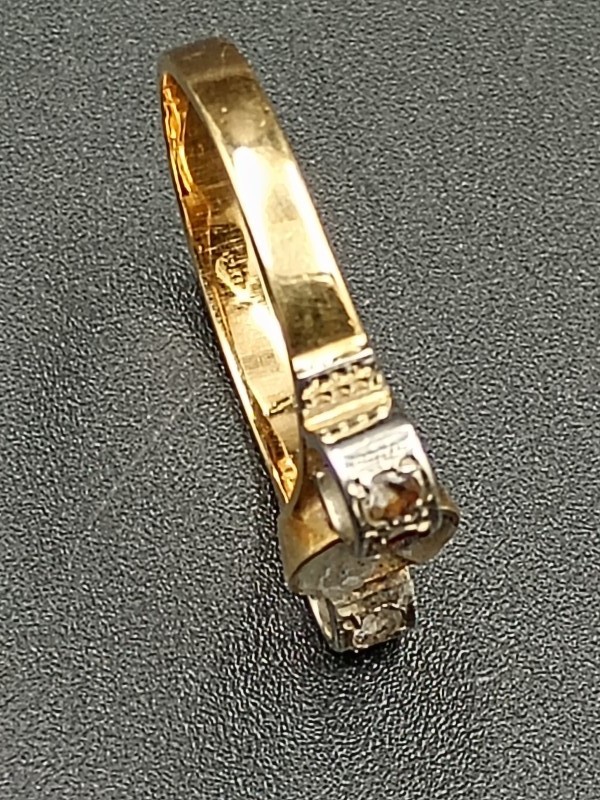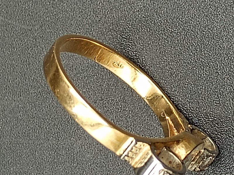 Deze elegante gouden ring is vervaardigd uit 18 karaat goud (gemerkt 0750 en chemisch getest) en heeft een verfijnde, klassieke uitstraling. De ring weegt 2,50 gram inclusief de steentjes en heeft een diameter van 16 mm. De zetting is 17 mm lang en de band is bijna 3 mm breed, wat zorgt voor een stevige en stijlvolle basis.