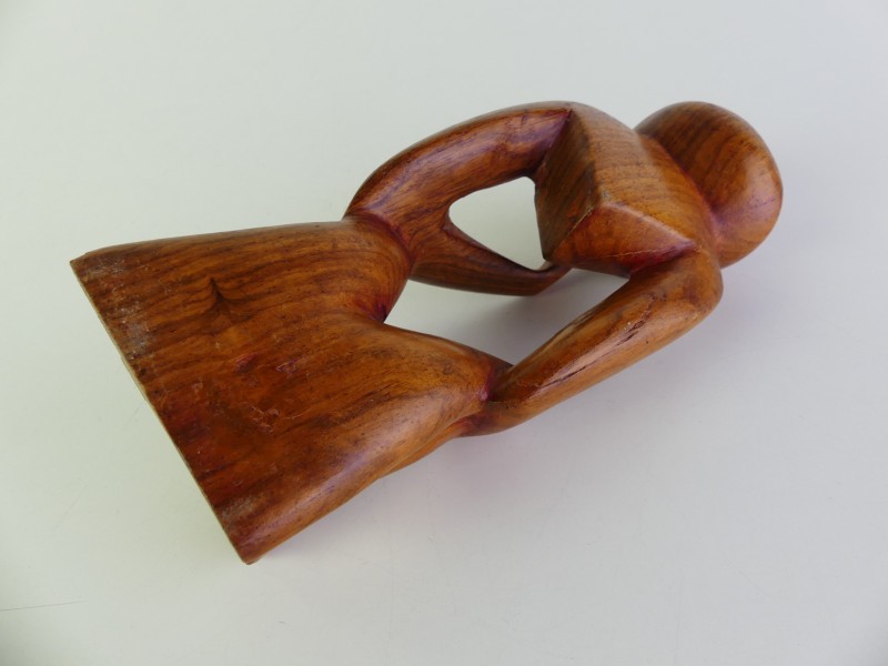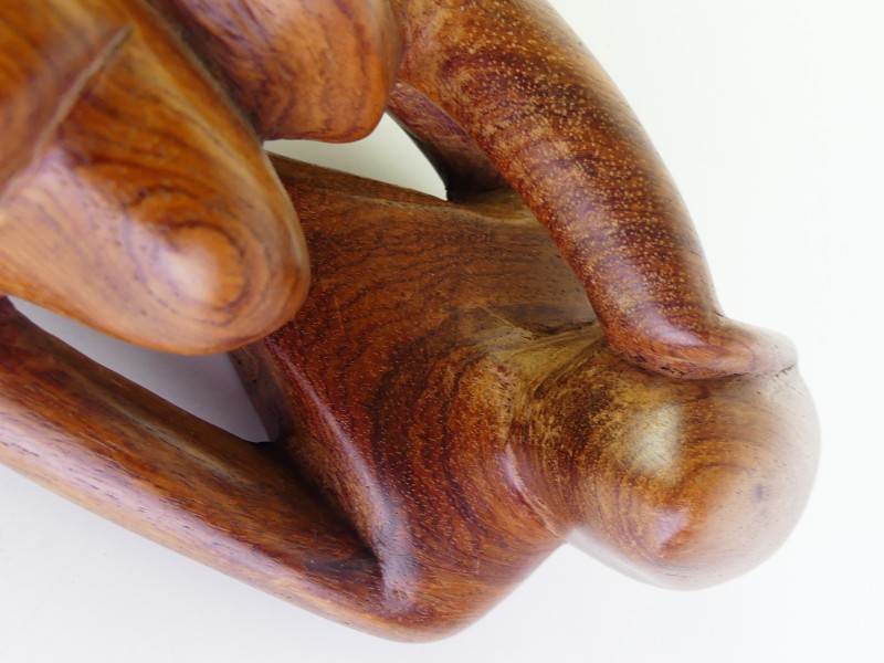 Twee abstracte houten beeldjes van een volwassen persoon en een kind die zitten te denken.
