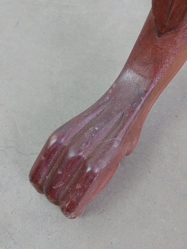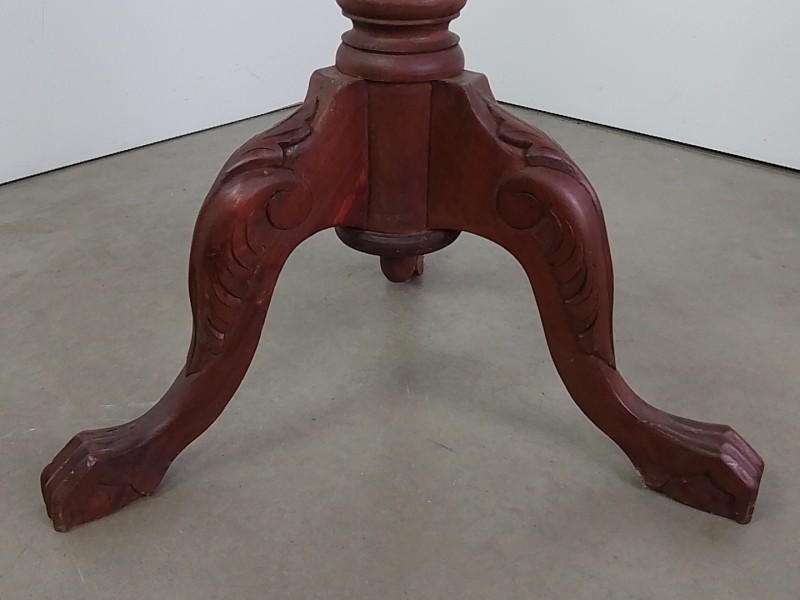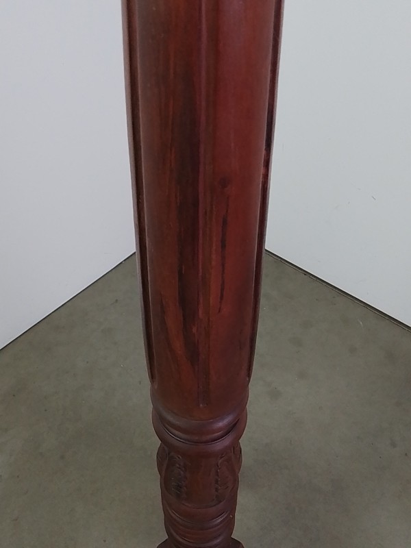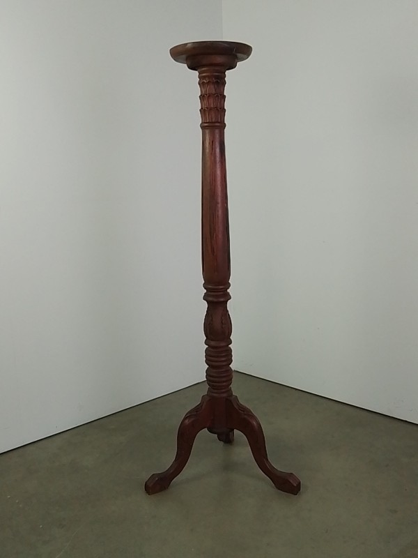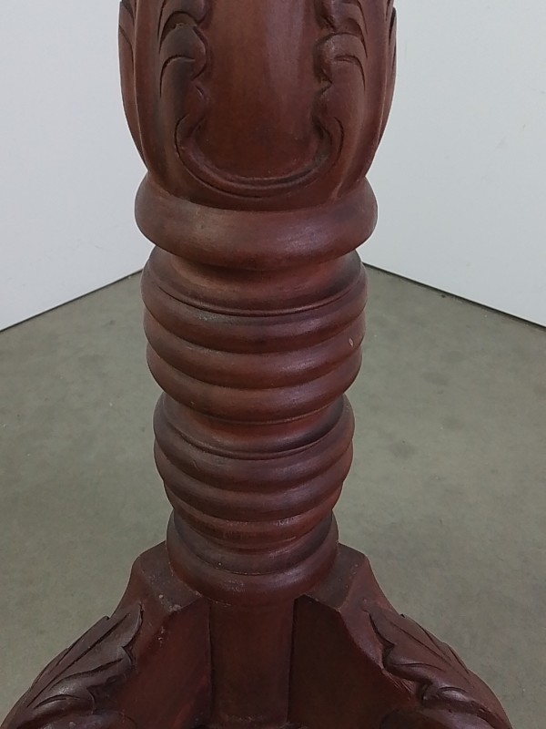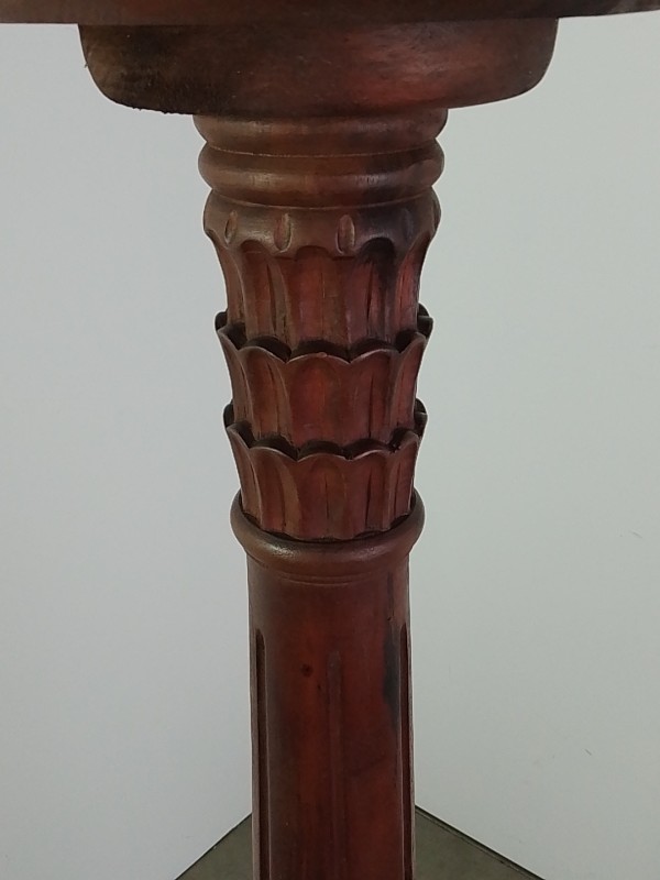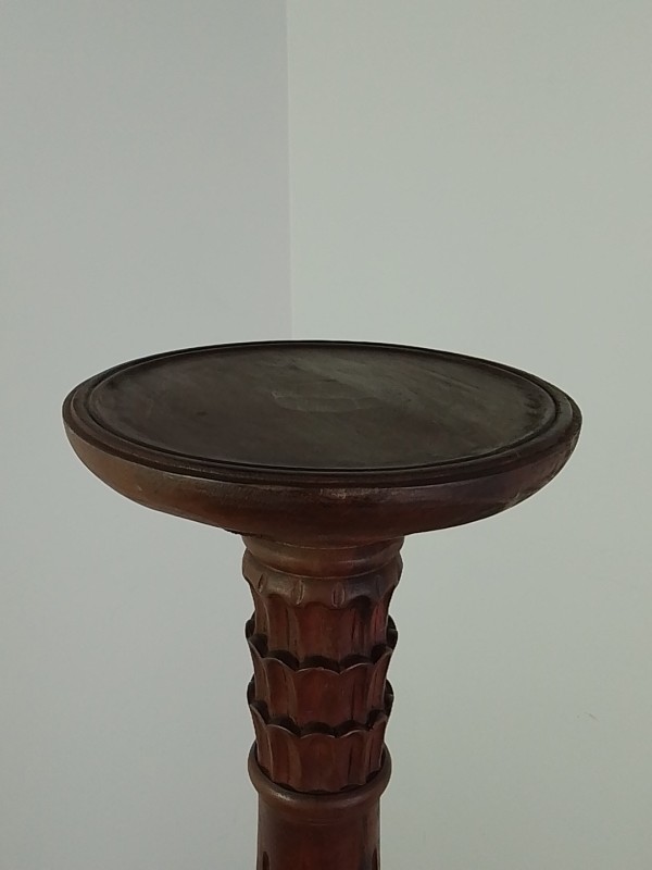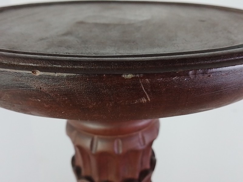 Handgemaakte houten plantenstandaard of piedestal, met rond blad en rijk gedraaide stam. Versierd met houtsnijwerk en staand op een driepootvoet met elegant gebogen poten. Donkerbruine afwerking. Een klassiek, decoratief meubelstuk, geschikt voor planten, beelden of vazen.