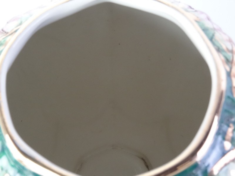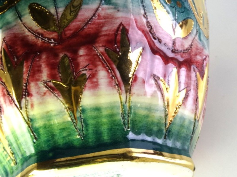 Kleurrijke vaas met deksel uit de Keralux-lijn van Boch Frères (La Louvière, België). Model Sultane, rijkelijk versierd met veelkleurige glazuren in groen, rood, paars en geel, met vergulde reliëfdecoratie. Gemerkt op de onderzijde: “Sultane – Gravé et peint à la main – Hand Painted – Keralux Boch Frères Belgium”. Originele fabriekssticker op het deksel aanwezig.