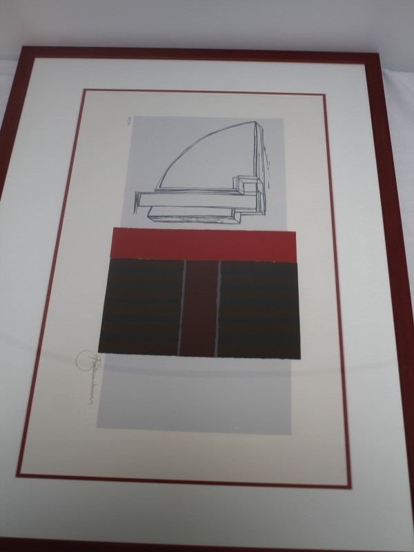 Abstract kunstwerk met stempel van het museum in Kasterlee. Handtekening van de kunstenaar is aanwezig, maar onduidelijk. Wij vermoeden van ANdré Saelemaekers. Wel zijn er 50 stuks van gemaakt, dit is 26/50.