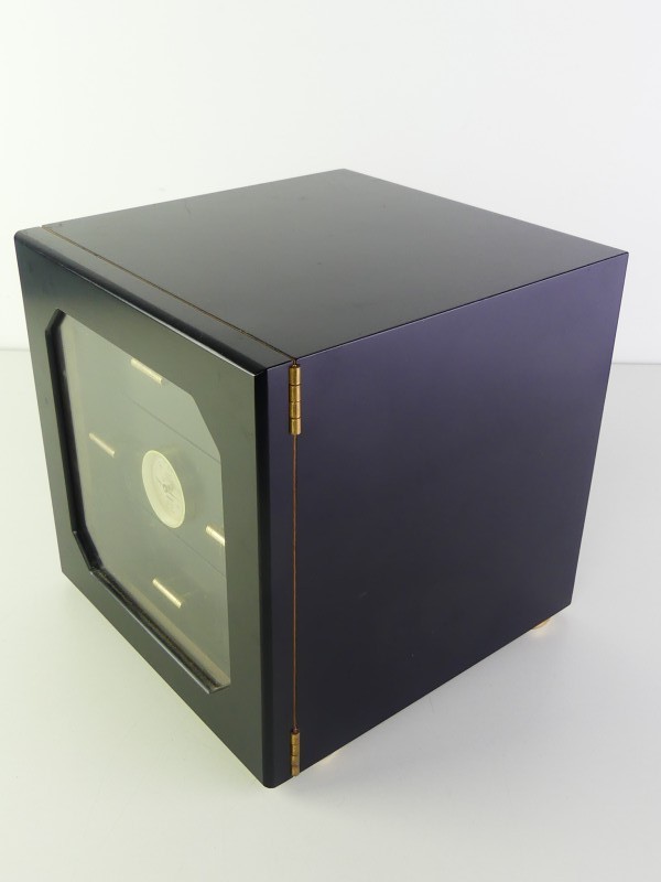 Elegante Adorini sigarenhumidor in zwart gelakte uitvoering, voorzien van een precisie-hygrometer en vergulde scharnieren en grepen.