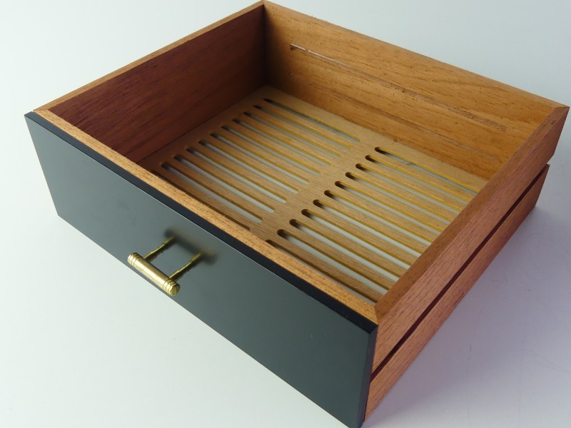 De binnenzijde is uitgevoerd in vermoedelijk Spaans cederhout, ideaal voor het behoud van sigarenaroma en vochtigheid.