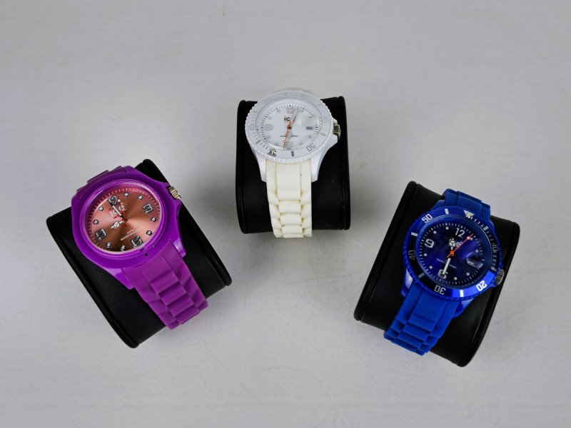 Set van 4 Ice-Watch horloges met opbergdoos + vintage Swatch Quartz (in doos).