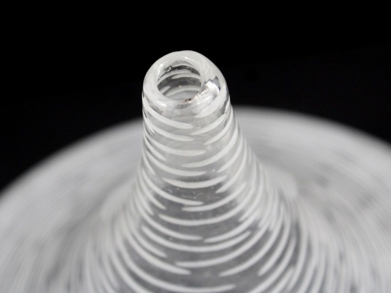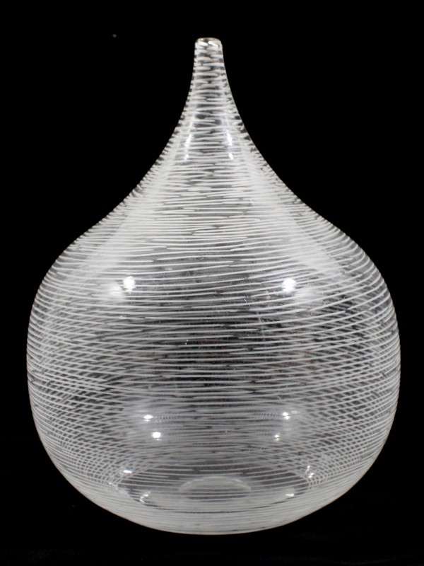 Uniek vormgegeven glazen vaas uit de jaren ’70, uitgevoerd in helder glas met een verfijnd lijnenspel. De elegante, bolvormige basis loopt vloeiend over in een smalle hals, wat zorgt voor een typisch tijdloos en sculpturaal ontwerp uit deze periode.