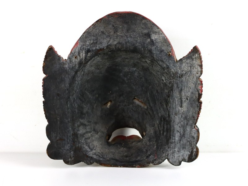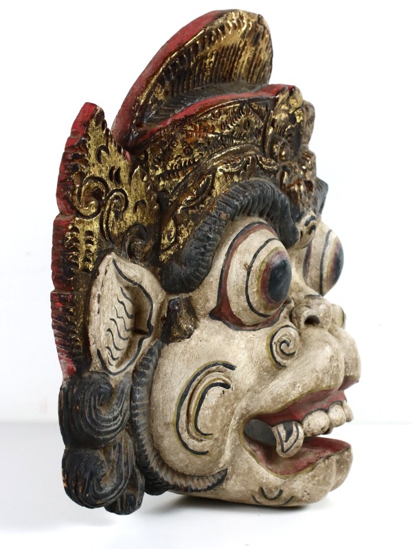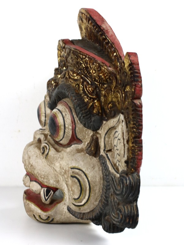 Dit indrukwekkende Barong-masker is een prachtig voorbeeld van traditioneel Balinees houtsnijwerk. Het masker is rijk gedetailleerd, met expressieve gelaatstrekken, opvallende bolle ogen en fijn uitgewerkte ornamenten in goudtinten. De doorleefde afwerking geeft het stuk een karaktervolle, bijna magische uitstraling.