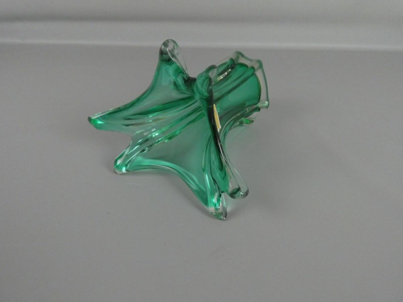 De vaas is uitgevoerd in een levendige groene kleur en heeft een unieke, stervormige opening. De elegante, geribbelde vorm en de zware, solide kwaliteit getuigen van het vakmanschap waar Fratelli Toso om bekend staat. Het originele Chambord-etiket met de fleur-de-lis is nog intact, wat dit stuk extra bijzonder maakt voor verzamelaars.