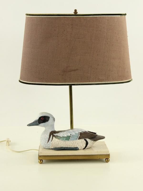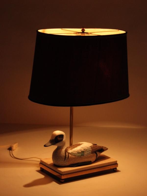 Bijzondere en decoratieve tafellamp met een natuurgetrouw vormgegeven eend als centraal element.
