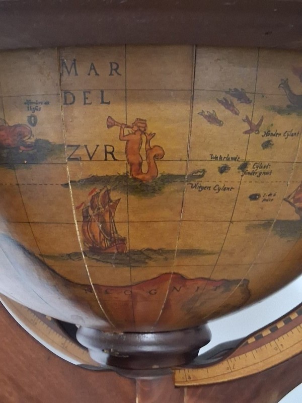 Decoratieve BAR Globe uitgevoerd als klassieke wereldbol in warme sepia- en bruintinten. De globe is voorzien van een antiek ogende wereldkaart met continentdetails en decoratieve scheepsillustraties. Het geheel rust op een elegant gedraaide houten standaard met drie sierlijk gevormde poten en houten meridiaan.