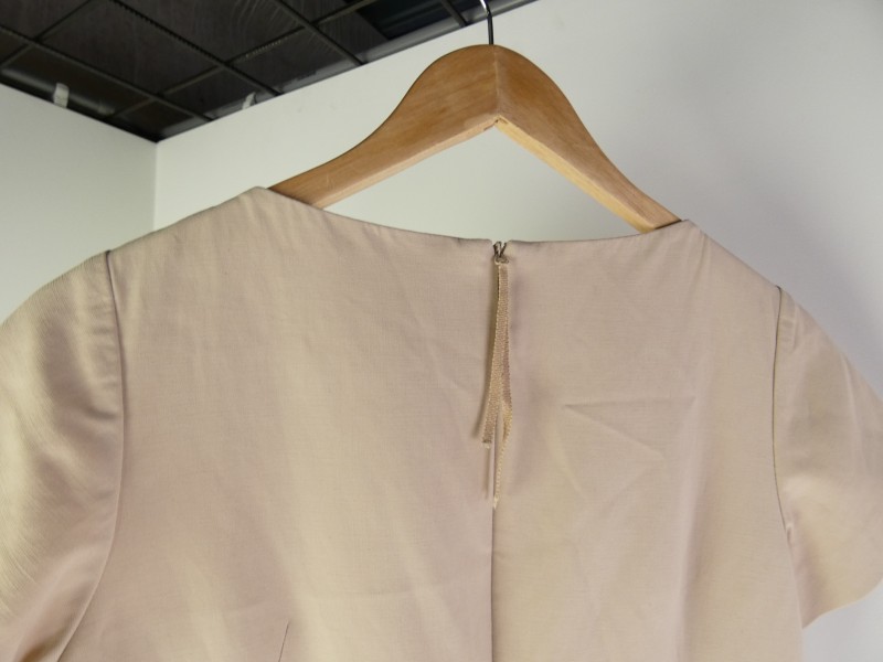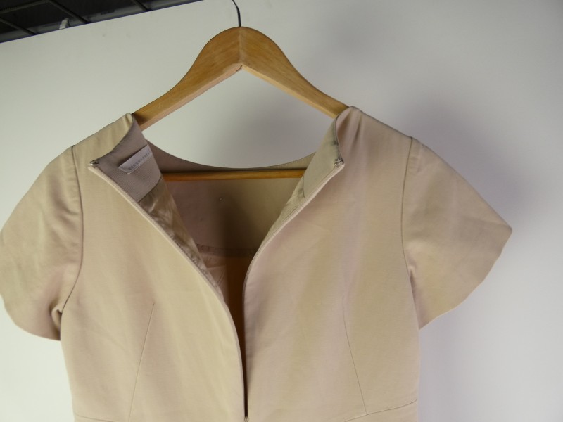 Stijlvolle en verfijnde jurk van Schumacher in een zachte beige/zandtint. De jurk heeft korte mouwen en een subtiel aansluitend silhouet dat de vrouwelijke vormen elegant accentueert. De ronde halslijn is afgewerkt met sierlijke rozenknopen (let op: één knoop ontbreekt), wat een romantisch detail toevoegt aan het klassieke ontwerp.