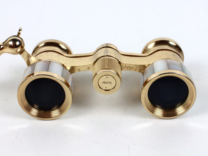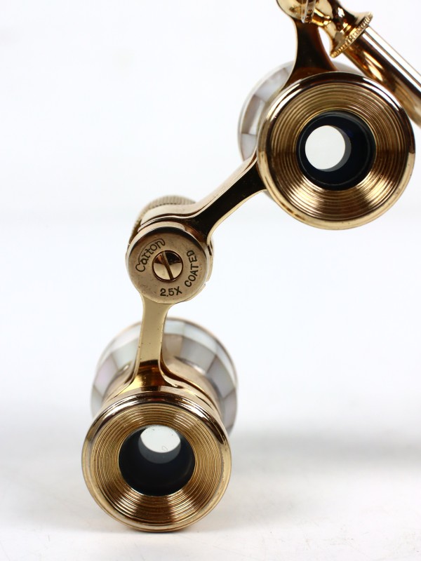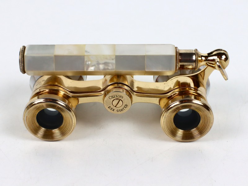 Dit object is een prachtige metalen Carton operabril, een miniverrekijker in prima staat. De verrekijker is voorzien van lamellen in parelmoer look rondom elke lens, afgewerkt met een goudkleurig rand voor een luxueuze uitstraling. Ook het handvat is elegant bekleed met dezelfde parelmoer look en goudkleurig, waardoor deze operabril direct opvalt!