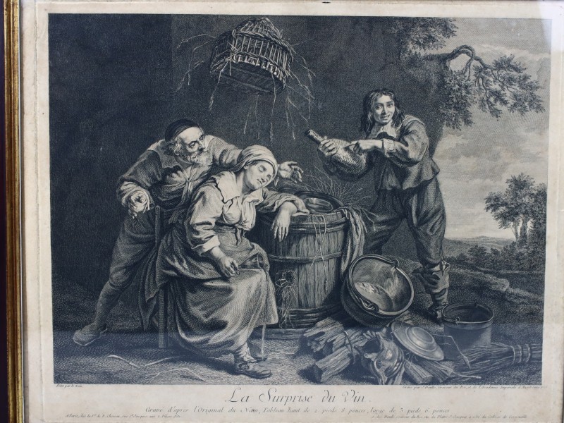 - Geschilderd door Le Nain – 'De verrassing van de Wijn' – gegraveerd door Jean Daullé, hofgraveur van de koning en lid van de Keizerlijke Academie van Augsburg, 1758.