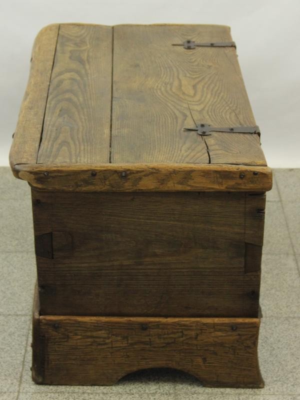 De kist beschikt over een scharnierend deksel en een originele sleutelopening aan de voorzijde, wat bijdraagt aan het historische karakter.