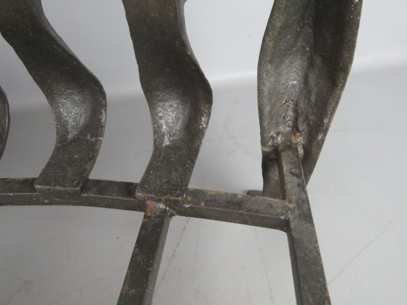 Dit is een haardbok van metaal met de afmetingen 57 x 35 x 34 cm. Het object bestaat uit een metalen rooster op poten en is aan de voorzijde gedecoreerd. De decoratie omvat twee verticale, hamerteken-achtige delen aan de zijkanten, die aan de bovenkant voorzien zijn van messing ringen. Tussen deze verticale delen is een horizontale, gedraaide messing staaf geplaatst. Aan deze staaf hangen zeven metalen, druppelvormige ornamenten met een gehamerd oppervlak, die met metalen beugels zijn bevestigd. Het geheel heeft een rustieke en ambachtelijke uitstraling, geschikt voor gebruik in een open haard.