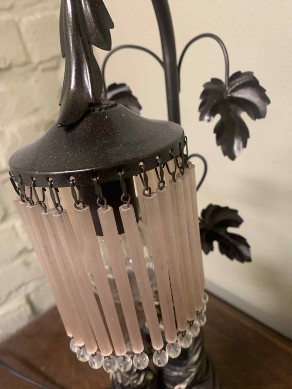 Prachtige Art Nouveau tafellamp vervaardigd uit een zwaar gepatineerde metaallegering. De lamp is gedetailleerd vormgegeven met een sculptuur van een vrouw en kind die samen een boek lezen. Aan de zijkant is een signatuur aanwezig. De kunstzinnig afgewerkte lampenkap met roze kunststof franjes geeft het geheel een sierlijke en authentieke uitstraling.