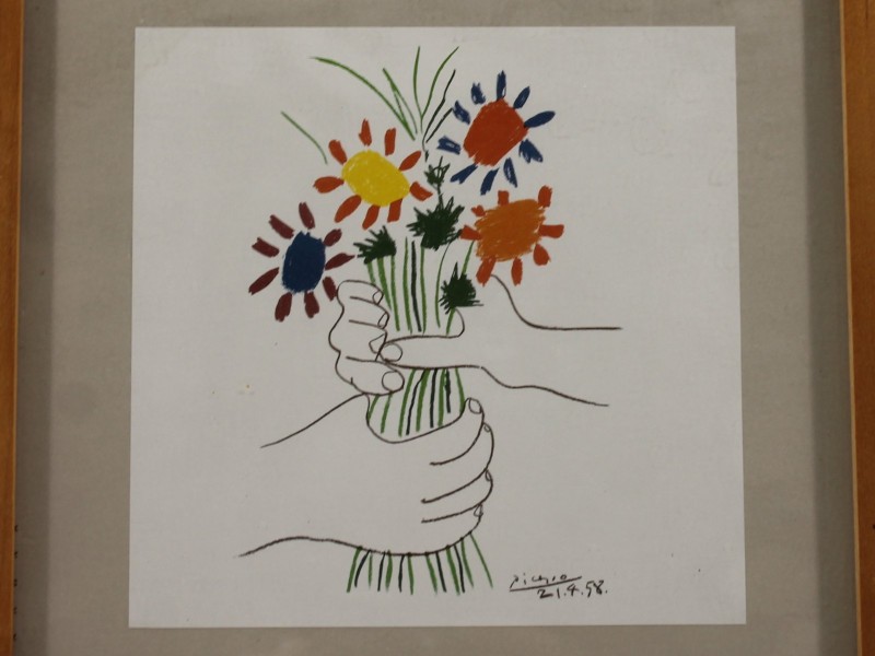 Kleurenreproductie van Picasso's Bouquet de Paix (21 april 1958) — twee handen die een kleurrijk boeket vasthouden, een van Picasso's meest herkenbare vredessymbolen. De reproductie draagt de gedrukte signatuur en datum van het origineel.