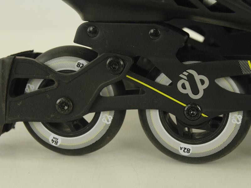 De skates hebben een strakke, sportieve uitstraling met een zwarte basis, contrasterend wit logo en opvallende fluogeel-accenten die zorgen voor een dynamische look. Het ontwerp oogt modern en functioneel, met stevige sluitingen en een comfortabele pasvorm.