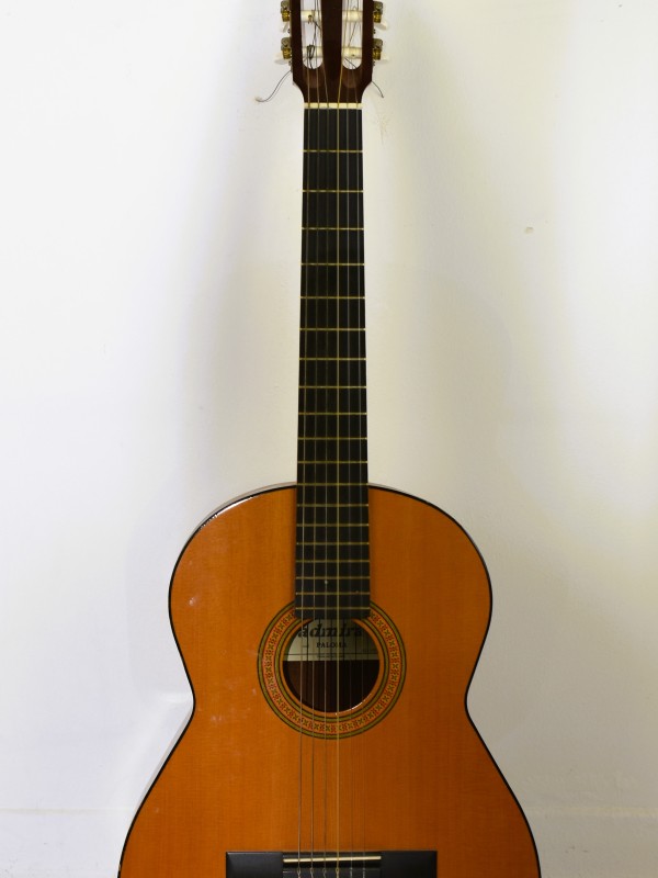 Deze akoestische gitaar is van het Spaanse merk Admira, model Paloma. Admira staat bekend om degelijk vakmanschap en is populair bij studenten en gevorderde spelers. De gitaar heeft een traditionele vorm, zes nylon snaren en een fijn afgewerkte klankkast met rozetdecoratie. Het bovenblad is vermoedelijk sparrenhout, de zij- en achterkant van mahonie of een vergelijkbare houtsoort. Gemaakt in Spanje, waar Admira sinds 1944 actief is.