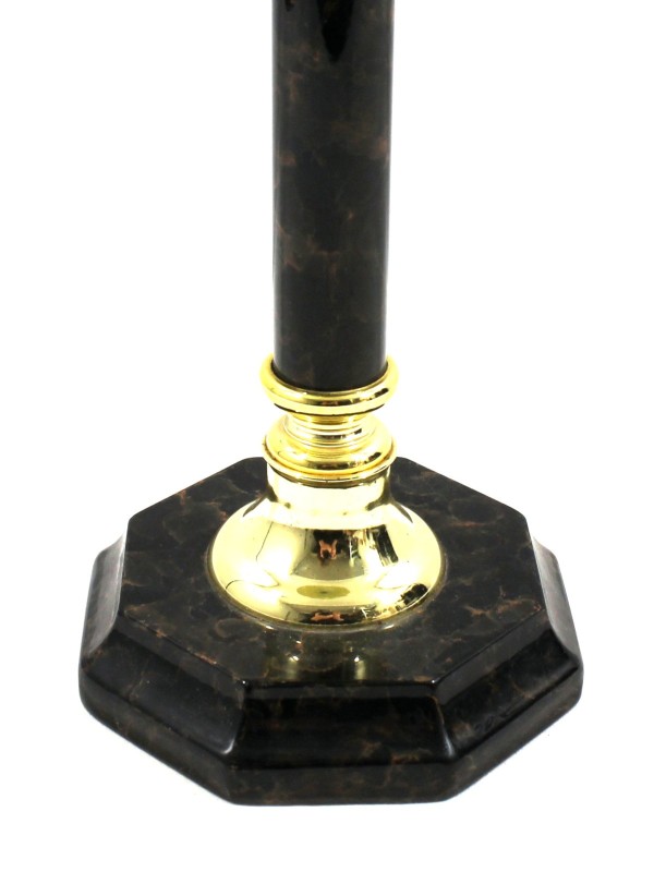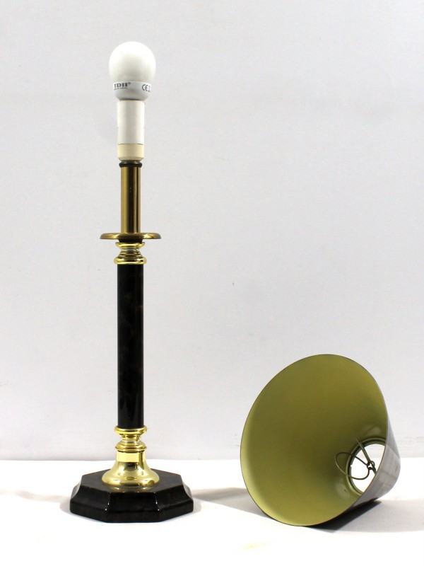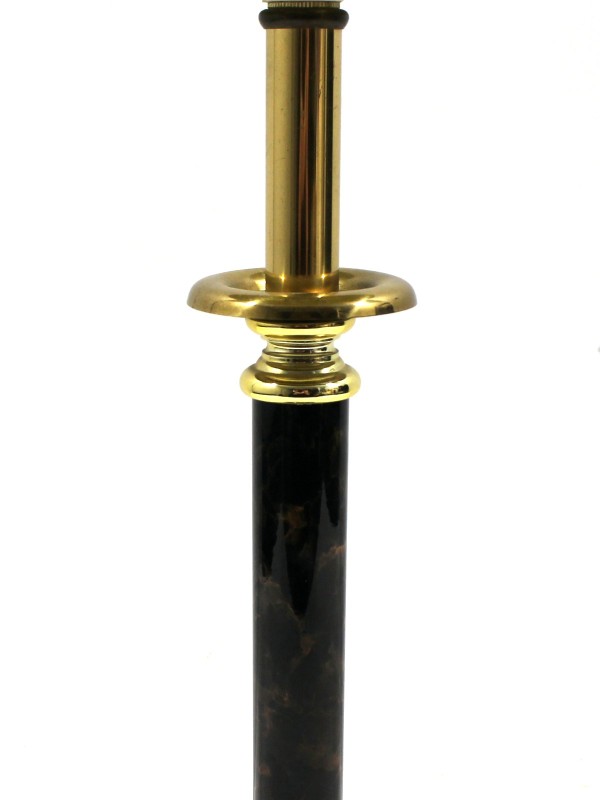 Een slanke en elegante tafellamp in klassieke colonnade-stijl, met een geraffineerd samenspel van glanzend zwart gelakt schacht en gepolijst messing ornamenten. De octagonale voet en de geprofileerde messingringen geven het geheel een uitgesproken neo-klassieke allure, verwant aan de Empire- en Directoire-stijl — een esthetiek die men wel omschrijft als style anglais of bibliotheekkamer-stijl.