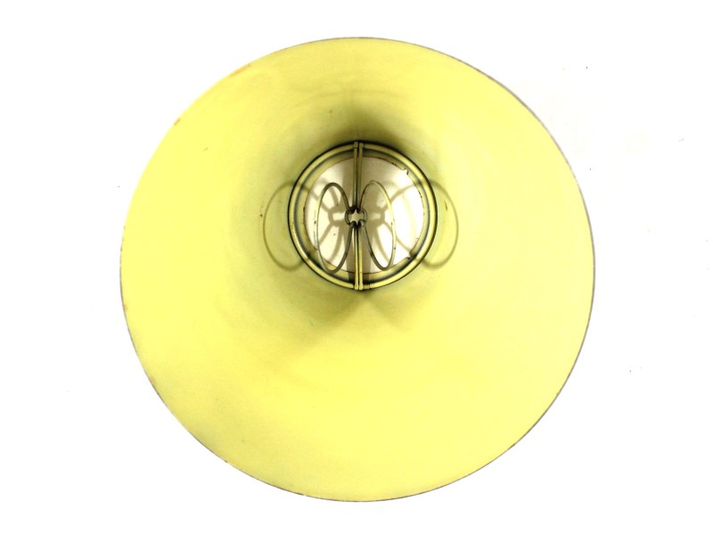 De bijhorende metalen kap is vanbuiten afgewerkt in een sierlijk zwart-gouden marmermotief, vanbinnen in warm olijfgroen — een combinatie die bij kunstlicht een bijzonder sfeervolle gloed geeft. De kap wordt bevestigd via een klembeugelsysteem dat rechtstreeks rond de lamp kliemt, zonder afzonderlijke kaphouder.