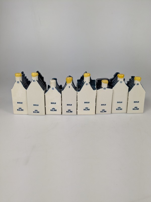 Een mooie collectie van originele KLM Delfts Blauwe huisjes van Bols. Deze huisjes worden traditioneel door KLM uitgedeeld aan passagiers in de World Business Class.