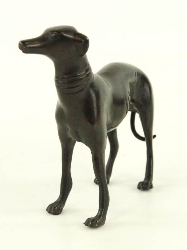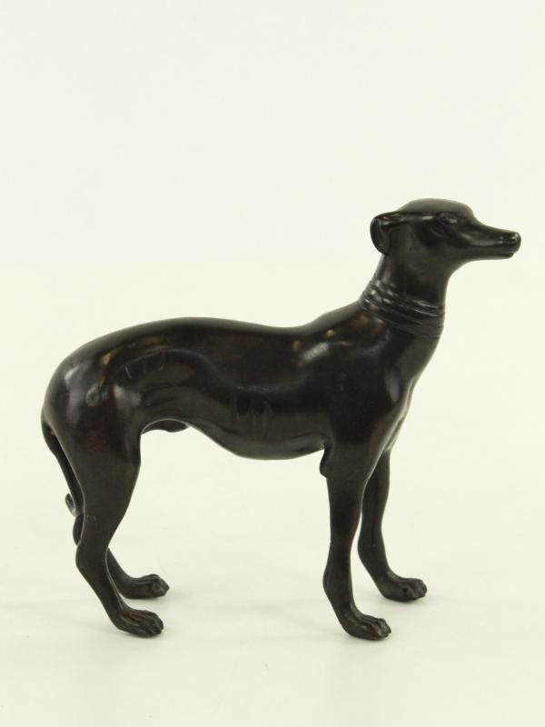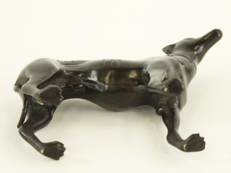 De slanke poten, de smalle taille en de lange hals met ingesneden lijnen die een halsband suggereren, geven het beeldje een verfijnde uitstraling.