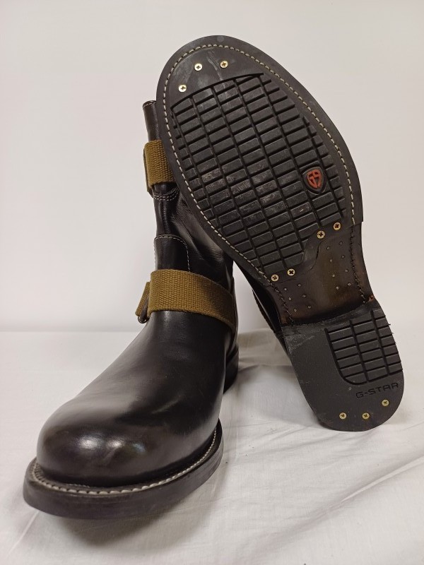 Zeer donkerbruin leder met kakigroene canvas gespen