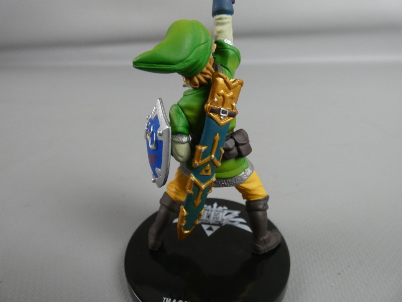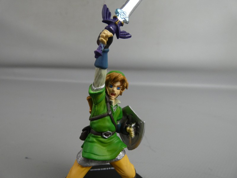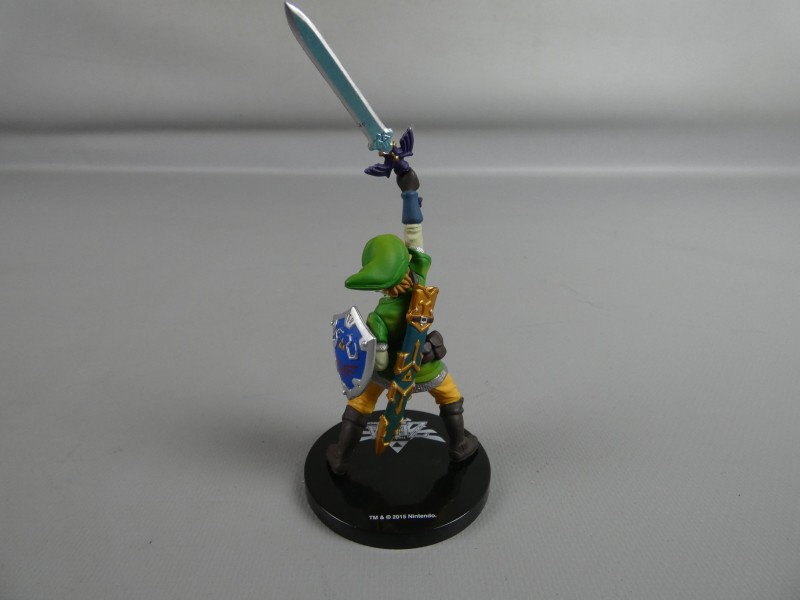Kenmerken: Link staat in een dynamische pose, waarbij hij het beroemde Meesterzwaard (Master Sword) boven zijn hoofd houdt en zijn Hylian Schild draagt. De figuur heeft gedetailleerde afwerkingen, inclusief zijn iconische groene tuniek en hoed, en de schede voor het zwaard op zijn rug.