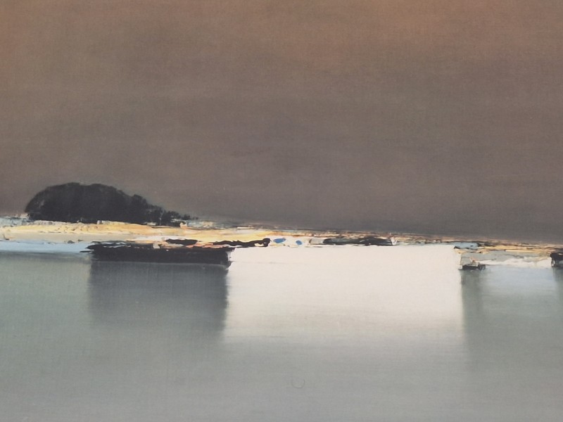 - Thema: Het kunstwerk toont een afgelegen haven, waar de horizon vervaagt in een mistige lucht. De compositie ademt rust en eenvoud uit, met een focus op de natuurlijke schoonheid van water en lucht.
