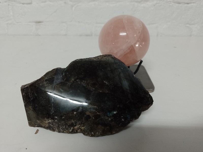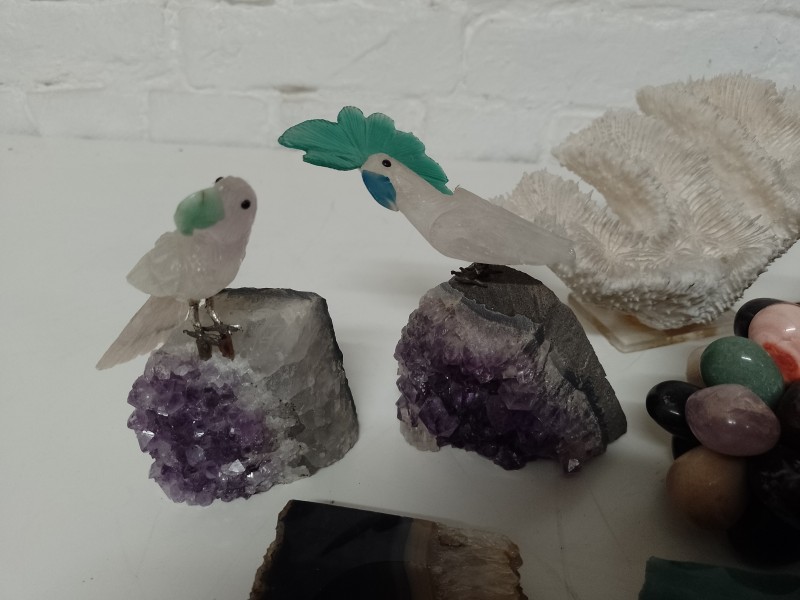- 2 amethiststenen, elk versierd met handgemaakte papegaai-figuurtjes