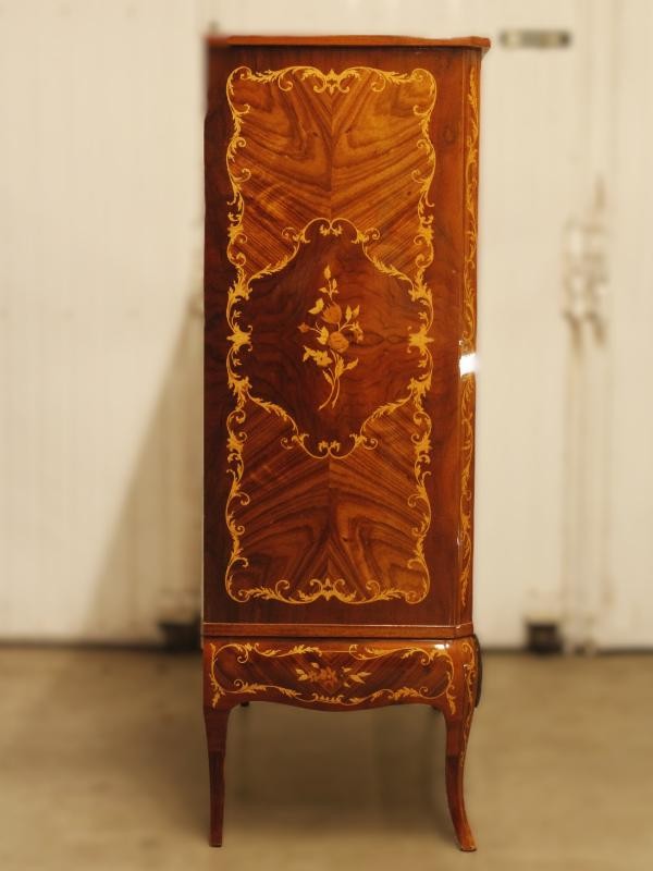 Zeer elegante Louis XV-stijl kast, rijk uitgevoerd met verfijnde marqueterie en florale inlegwerken.