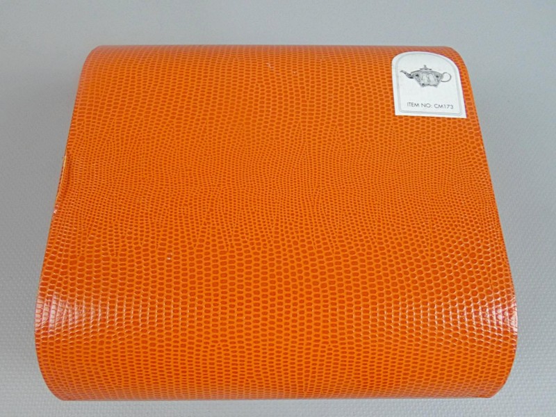 Plat, waaiervormig theepotje met een deksel en handvat.