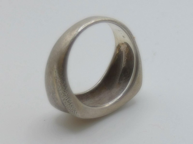De ring heeft een moderne en abstracte uitstraling.