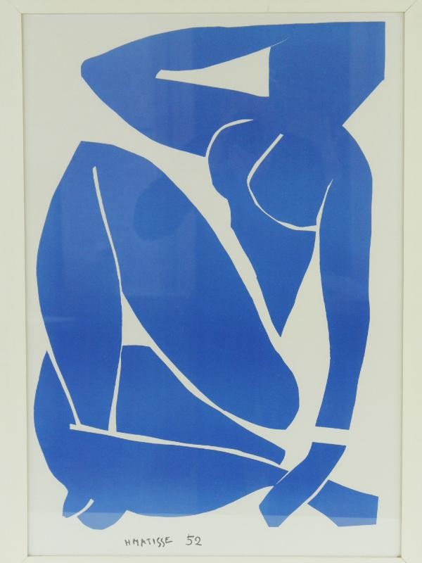 Deze ingekaderde kunstposter toont Nu Bleu II (Blauwe naakt II), een beroemde afbeelding van de Franse kunstenaar Henri Matisse (1869–1954). Het gaat nadrukkelijk om een poster/print en niet om een origineel werk of gesigneerde lithografie. De voorstelling toont een gestileerd vrouwenlichaam in een zittende houding, opgebouwd uit felblauwe vormen tegen een witte achtergrond. Onderaan de afbeelding is de naam "H. Matisse" en het jaartal "52" gedrukt, verwijzend naar de periode waarin de kunstenaar deze reeks werken realiseerde.