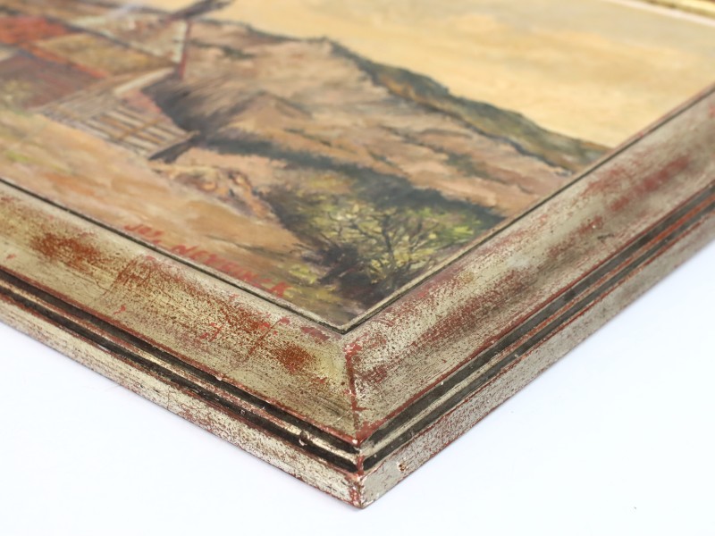Rechtsonder is het schilderij gesigneerd met “Jos. Neyrinck”. Het werk hangt in een charmante, licht verweerde goudkleurige lijst die uitstekend past bij de nostalgische uitstraling van het geheel.