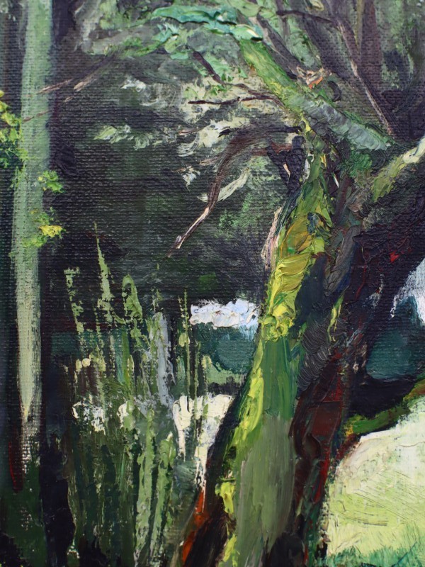 In dit schilderij valt op hoe de verf niet overal glad is aangebracht, maar hier en daar in een dik, pasteus reliëf op het doek ligt. Deze impastotechniek geeft het werk een voelbare levendigheid: het licht vangt zich in de opstaande verf, waardoor bladeren, boomschors en waterpartijen een tastbare diepte krijgen.