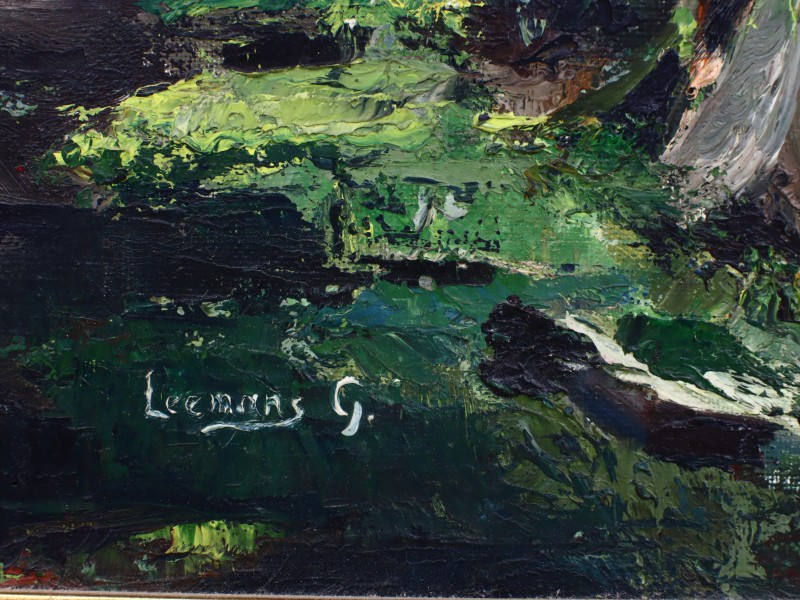Dit zeer mooi schilderij is een olieverf op doek, gesigneerd door Leemans G. linksonder. De voorstelling toont een bosachtig landschap met een kronkelende boom op de voorgrond. Het gebladerte is weelderig en groots weergegeven met brede, expressieve penseelstreken in verschillende tinten groen, afgewisseld met lichte accenten van wit en geel om het zonlicht door de bladeren te suggereren.