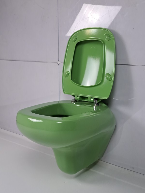Dit wandtoilet is een opvallend ontwerp uit de jaren 70. De felgroene kleur is typisch voor sanitair uit deze periode. Het toilet is gemaakt van keramiek met een glanzende afwerking. Het model is compact en wordt aan de muur bevestigd, zonder zichtbare afvoer op de vloer. De zitting en deksel zijn in bijpassend groen uitgevoerd. Dit soort toiletten werd vaak geplaatst in modernistische of futuristische interieurs. De kleur maakt dit een verzamelwaardig object voor liefhebbers van retrodesign of restauratieprojecten.